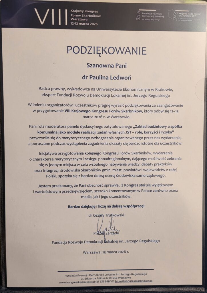 Z przyjemnością informujemy, że dr Paulina Ledwoń została zaproszona do udziału w VIII Krajowym Kongresie Forów Skarbników, który odbył się w dniach 12–13 marca 2026 r. w Warszawie. Kongres jest jednym z największych wydarzeń w Polsce dedykowanych skarbnikom jednostek samorządu terytorialnego – zgromadził w stolicy blisko 850 uczestników z całego kraju. Podczas kongresu dr Ledwoń moderowała panel pt. „Zakład budżetowy a spółka komunalna jako modele realizacji zadań własnych JST – role, korzyści i ryzyka”. Dr Ledwoń otrzymała od organizatorów podziękowanie za udział i wkład merytoryczny; więcej informacji znajduje się na stronie wydarzenia: kongresskarbnikow.pl.